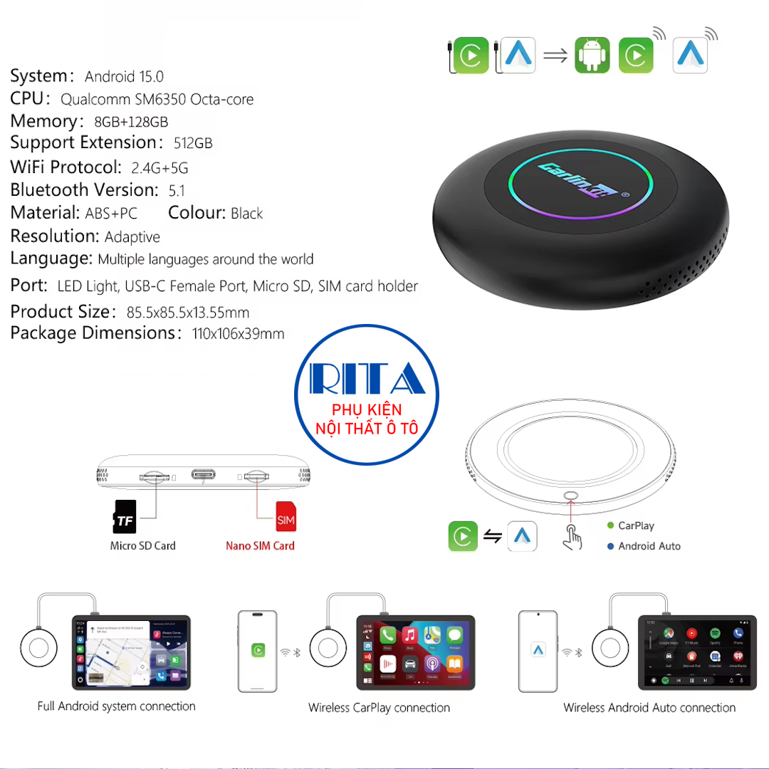 CÔNG TY TNHH TM RITA Showroom1: 181 Nguyễn Đình Chính, Phường Phú Nhuận, Tp.HCM Showroom2: Shophouse 0.17, Chung cư Osimi Tower, Lê Đức Thọ, An Hội Đông, Tp.HCM Hotline: 0909 280 812 - 0707 707 812 - 0984 809 812 - 0779 000 812 (-) GIÁ SẢN PHẨM: 4.750.000 Mua kèm bản quyền Vietmap Live Plus 3 năm: 490.000 Mua kèm bản quyền Vietmap Live Plus 2 năm: 390.000 Mua kèm bản quyền Vietmap Live Pro 1 năm: 390.000 Mua kèm bản quyền Vietmap Live Pro 2 năm: 590.000 (-) BỘ CÀI ĐẶT CHUNG THEO BOX: + Trợ lý giọng nói Kiki + Youtube không quảng cáo. + Vietmap S2 cảnh báo giao thông. + Google Maps chỉ đường. + ZingMp3, Nexfix, Spotify.... (-) THÔNG TIN SẢN PHẨM: + Biến màn hình zin theo xe thành màn hình android + Chip Snapdragon SM6350 8-Core + Ram 8Gb, Rom 128Gb, Chip xử lý đồ họa Adreno 619 + Tích hợp Wireless Carplay và Wireles Android Auto + Tích hợp điều khiển giọng nói Kiki + Hổ trợ dẫn đường Vietmap S2, Google Maps. + Hổ trợ nhiều ứng dụng giải trí: Kho ứng dụng CHPlay + Dễ dàng cài đặt, chỉ cần cắm là xài. + Thiết kế nhỏ gọn, cấu hình mạnh mẽ. + Sử dụng hệ điều hành Android 15. + Hổ trợ cập nhật phần mềm online bằng FOTA + Chia đôi màn hình, xài đa ứng dụng. | |