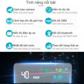 Hud hiển thị kính lái Vietmap H1X sẽ cung cấp thông tin cần thiết của xe và hổ trợ cảnh báo giao thông, Hud được đặt ngay tầm nhìn của người lái nên góp phần hổ trợ người lái xe không phải thay đổi góc nhìn, giúp việc lái xe dễ dàng và an toàn hơn.